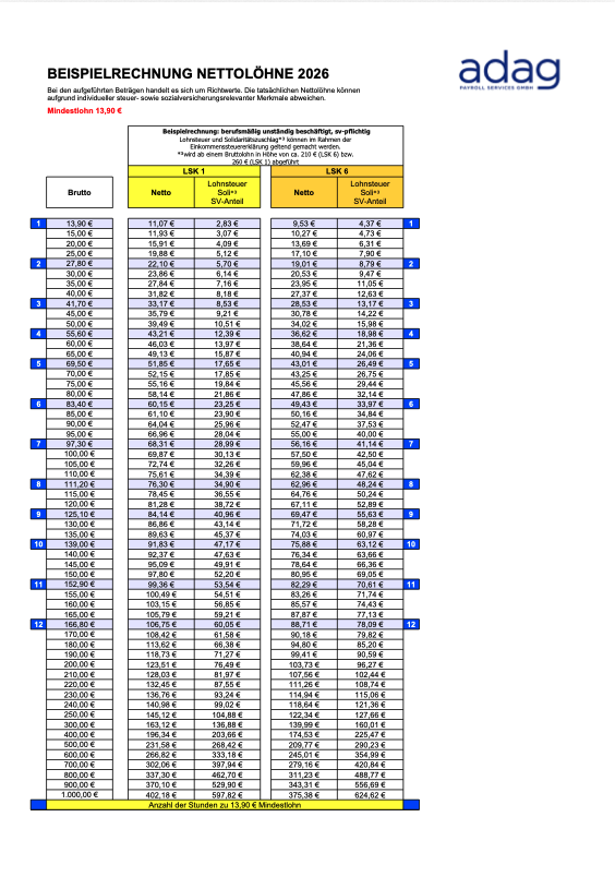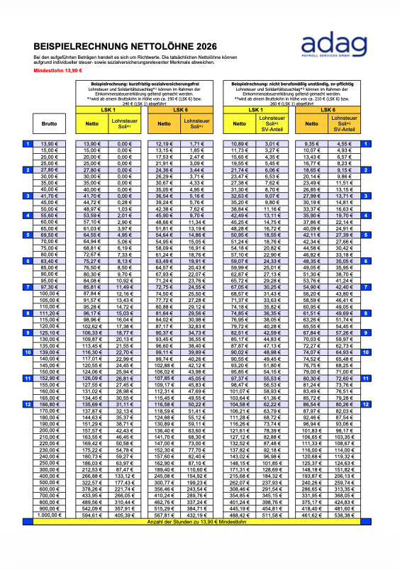 Net wage calculations of salaries for professional nonemployees for 2026. The amounts listed are indicative. Actual net wages may differ due to individual tax and social security characteristics.